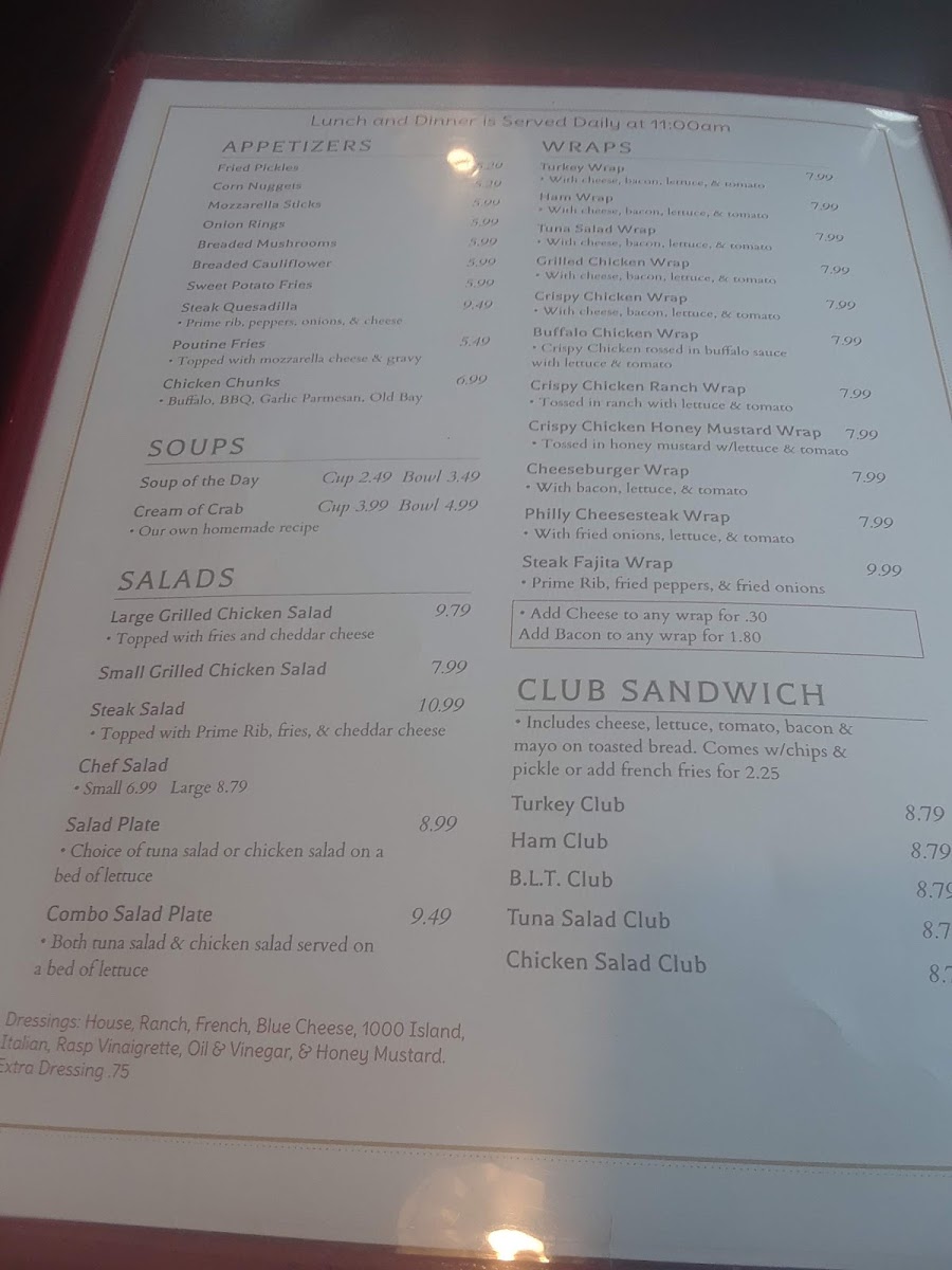 Start your day with simple favorites like biscuits and gravy or the cinnamon roll pancake special, perfect for a slow morning or weekend treat. Midday and evening options include comforting plates such as meatloaf and mashed potatoes, stuffed cabbage rolls, or the prime rib queen, often paired with fresh sides like vegetable of the day or a baked sweet potato. Lighter offerings like salads or the blt club sandwich provide balance without losing that home-style feel.